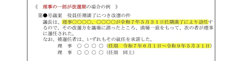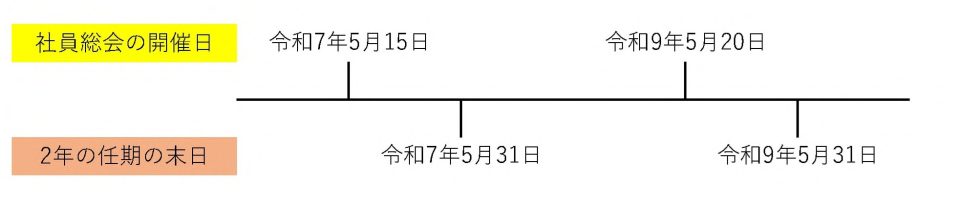 すなわち、この方の任期は「令和7年6月1日から令和9年6月1日まで」の2年間となってしまい、あらかじめ就任を承諾していた理事と任期がズレることになってしまうのです。